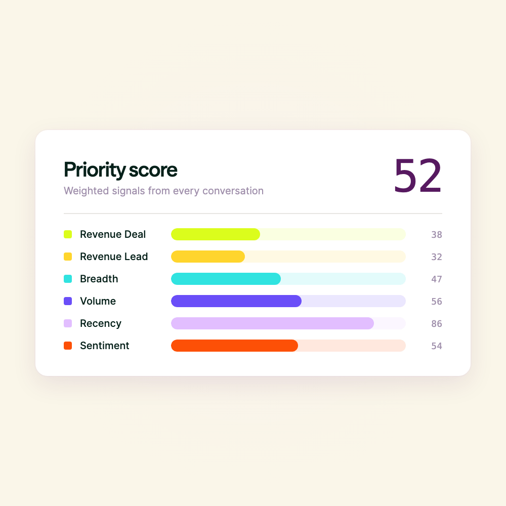 Customer profiles aggregate every conversation, ticket, and signal into one view. Spot churn risk early. Show product the patterns sales can't.