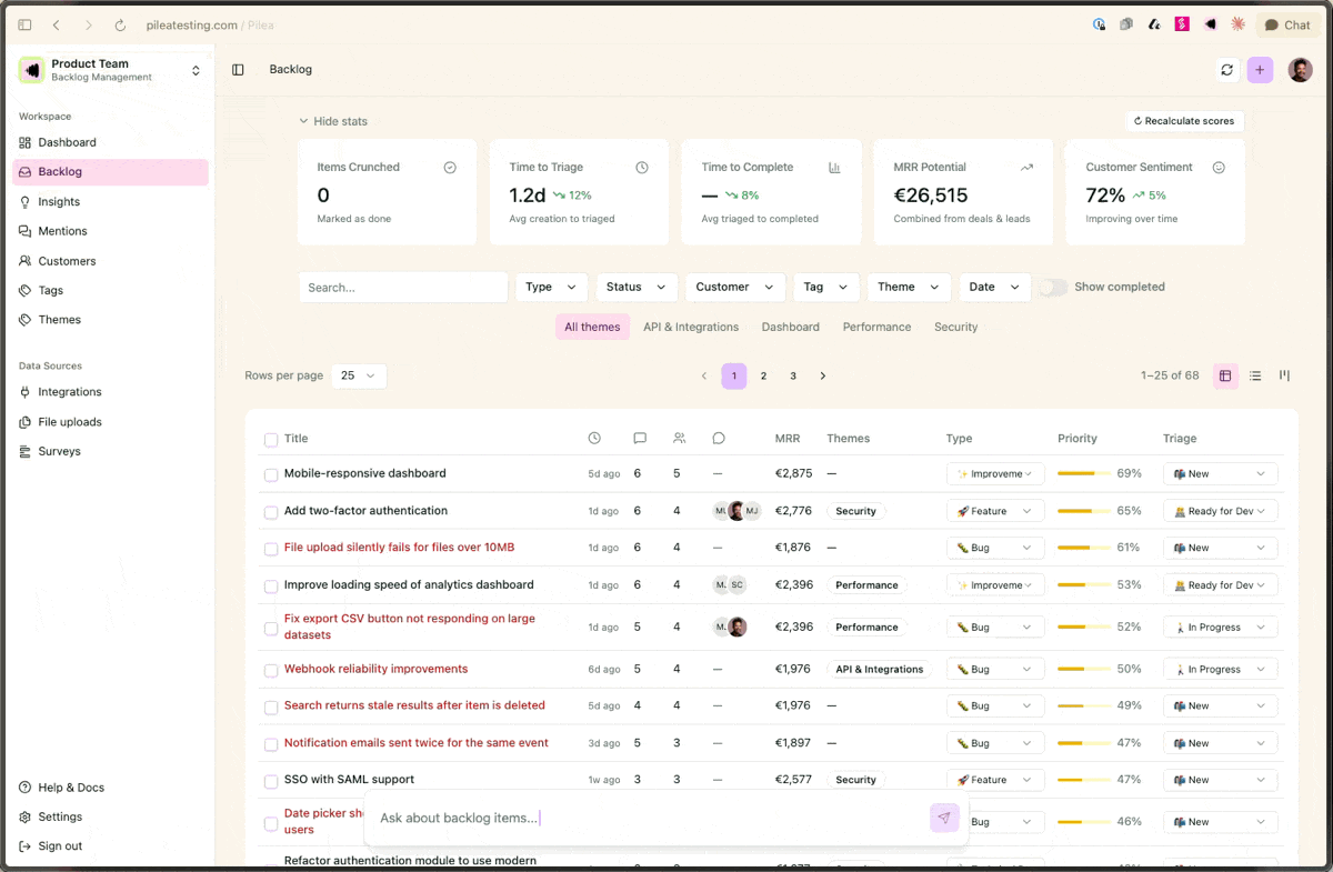 Pilea automatically tags feedback by theme, clusters requests, detects sentiment, prioritises and quantifies the revenue opportunity of each customer signal.